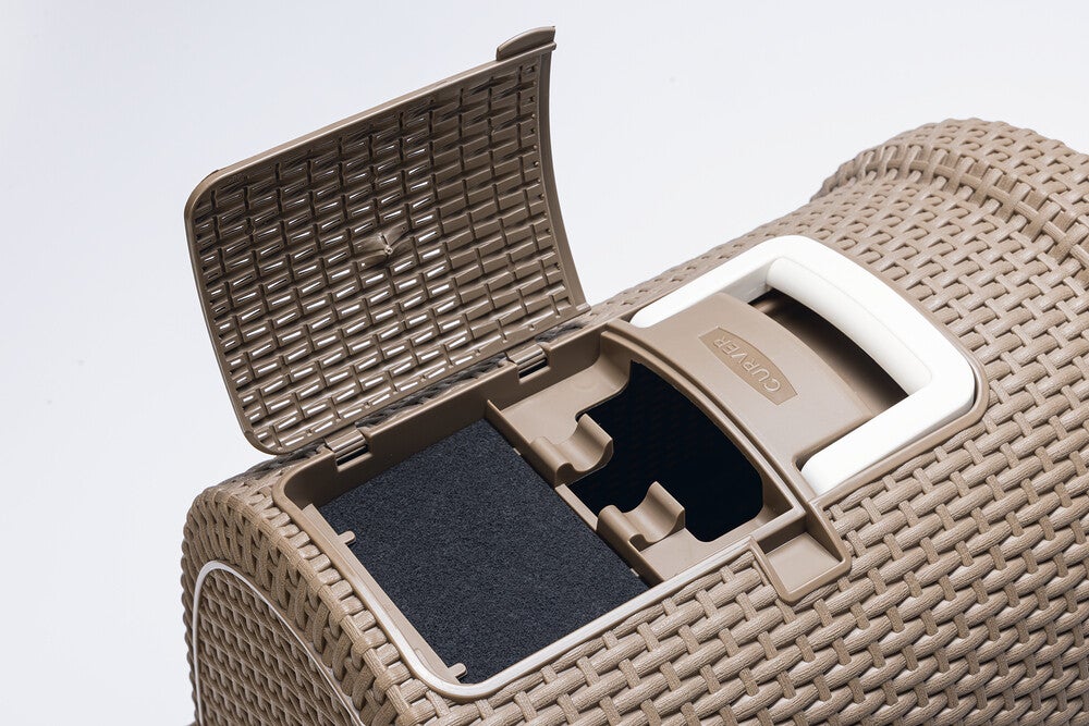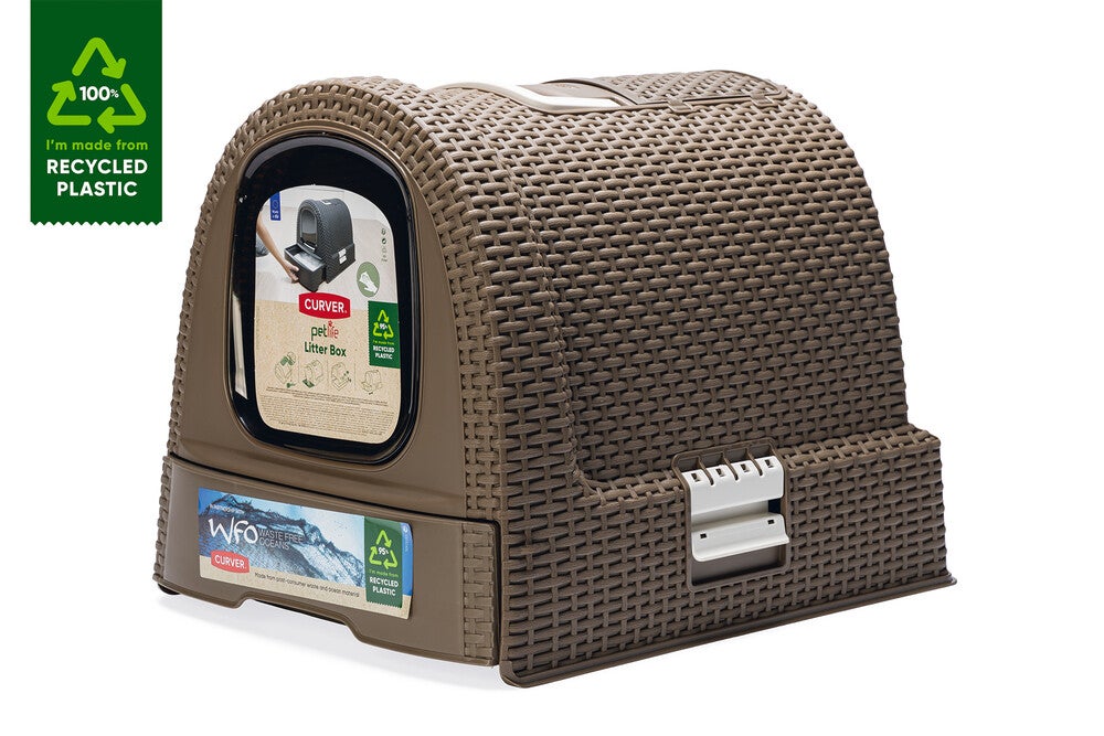 Deze Curver Kattenbak bestaat voor 95% uit gerecycled materiaal (huishoudelijk plastic afval en oude visnetten op de bodem van de zee (ocean waste)). De overige 5% zijn nieuwe grondstoffen. De hele kattenbak is op zijn beurt ook weer 100% recyclebaar. De kattenbak heeft een modieuze uitstraling doordat het een motief heeft van gevlochten rattan. De lade aan de voorkant heeft een plateau met gaatjes, waardoor de kat een groot deel van het kattenbakgrit achterlaat in de bak alvorens de kattenbak te verlaten. Door de uitschuifbare lade kan je in een oogopslag zien of de kattenbak aan verschoning toe is. Aan de bovenkant van de kattenbak bevindt zich een klepje waar de kattenbakschep opgeborgen kan worden. De Curver Kattenbak is zo mooi dat je nauwelijks ziet dat het een kattentoilet is.