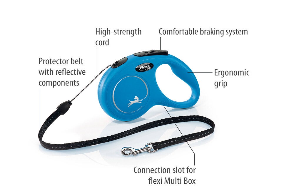 De Flexi New Classic Hondenriem S is de perfecte riem voor honden met een gewicht van maximaal 12 kilo. Deze koord rollijn heeft een verbeterd remsysteem. Hierdoor kun je in 1 beweging het uitrolsysteem een halt toe roepen. Verplaats je vinger over het schuifje van het remsysteem, dan blijft de rollijn op de gewenste lengte vast staan. Er is sprake van een gecontroleerde vrijheid, doordat je zelf kan bepalen hoeveel meter je jouw hond geeft.